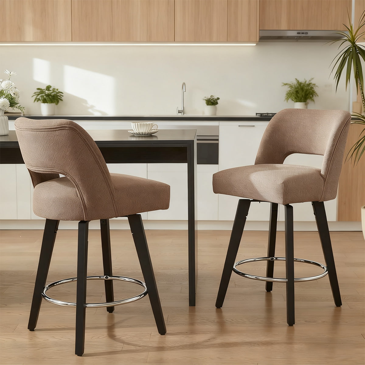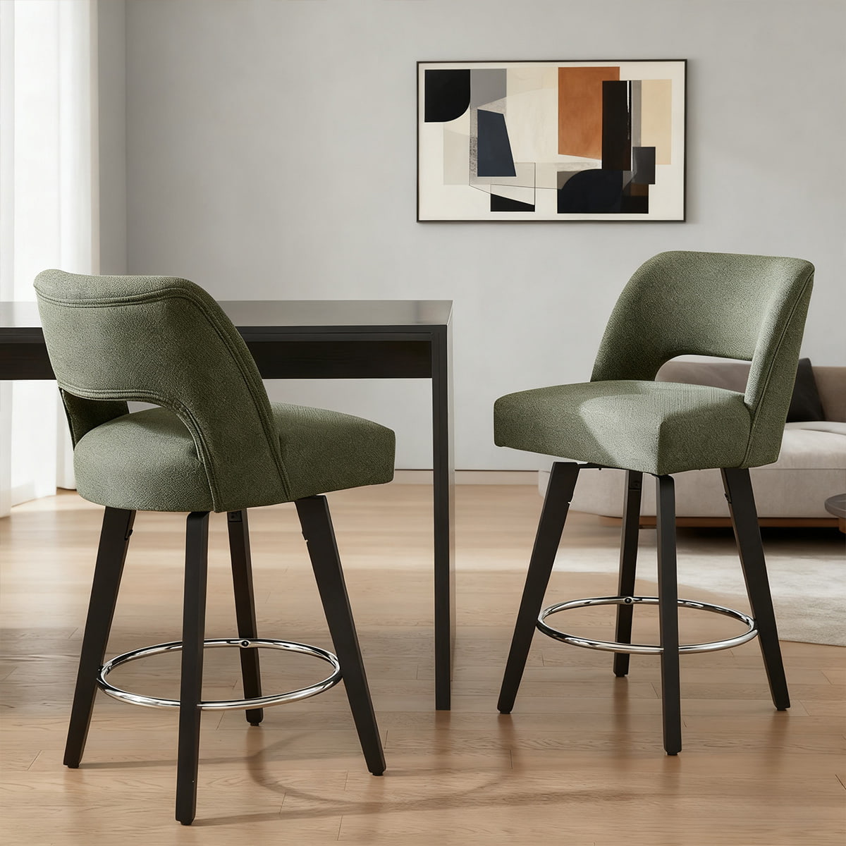DUOMEI Green Swivel Counter Height Barstol redefinerer moderne komfort med sin ergonomiske form og førsteklasses linnedpolstring. Designet til både bolig- og erhvervsbrug, denne 360° drejelige taburet parrer et blødt polstret sæde med en robust træramme og forkromet fodstøtte, hvilket skaber en luksuriøs, men holdbar siddeløsning til køkkener, barer og caféer.