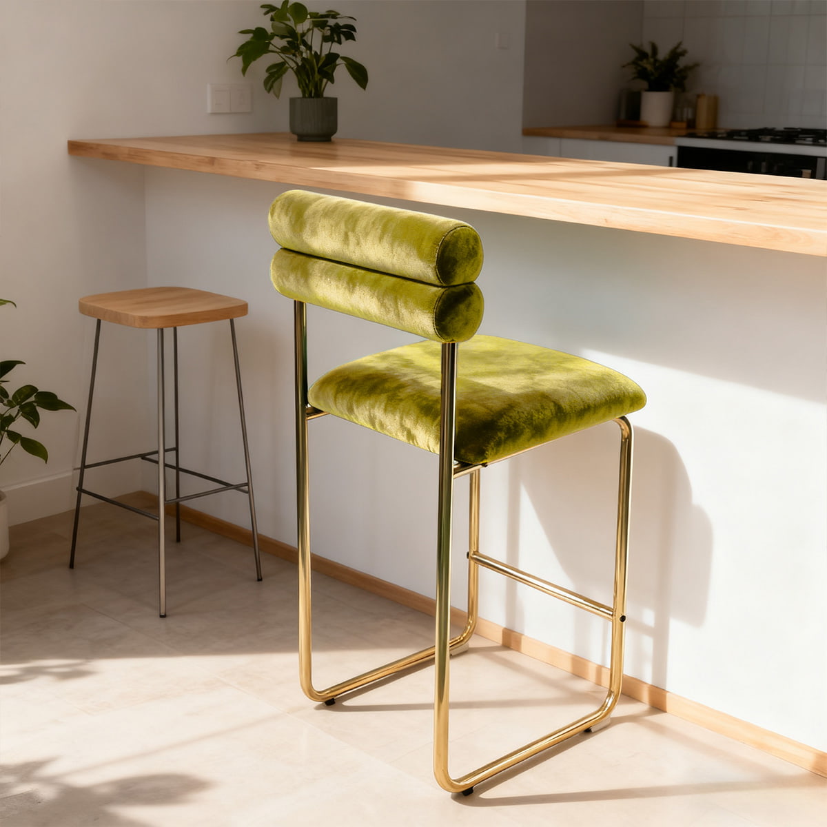 Moderne grøn fløjl i modhøjde barstol med gylden metalramme og fodstøtte — minimalistisk polstret stol til køkkenø, spisestue, café eller reception