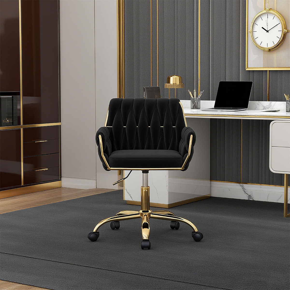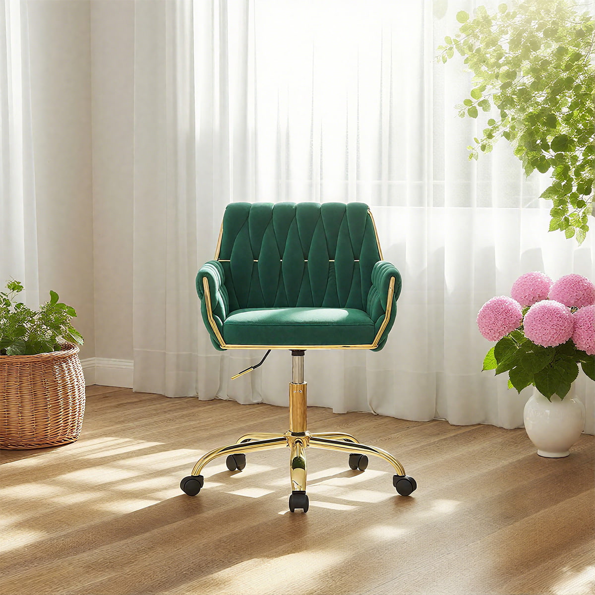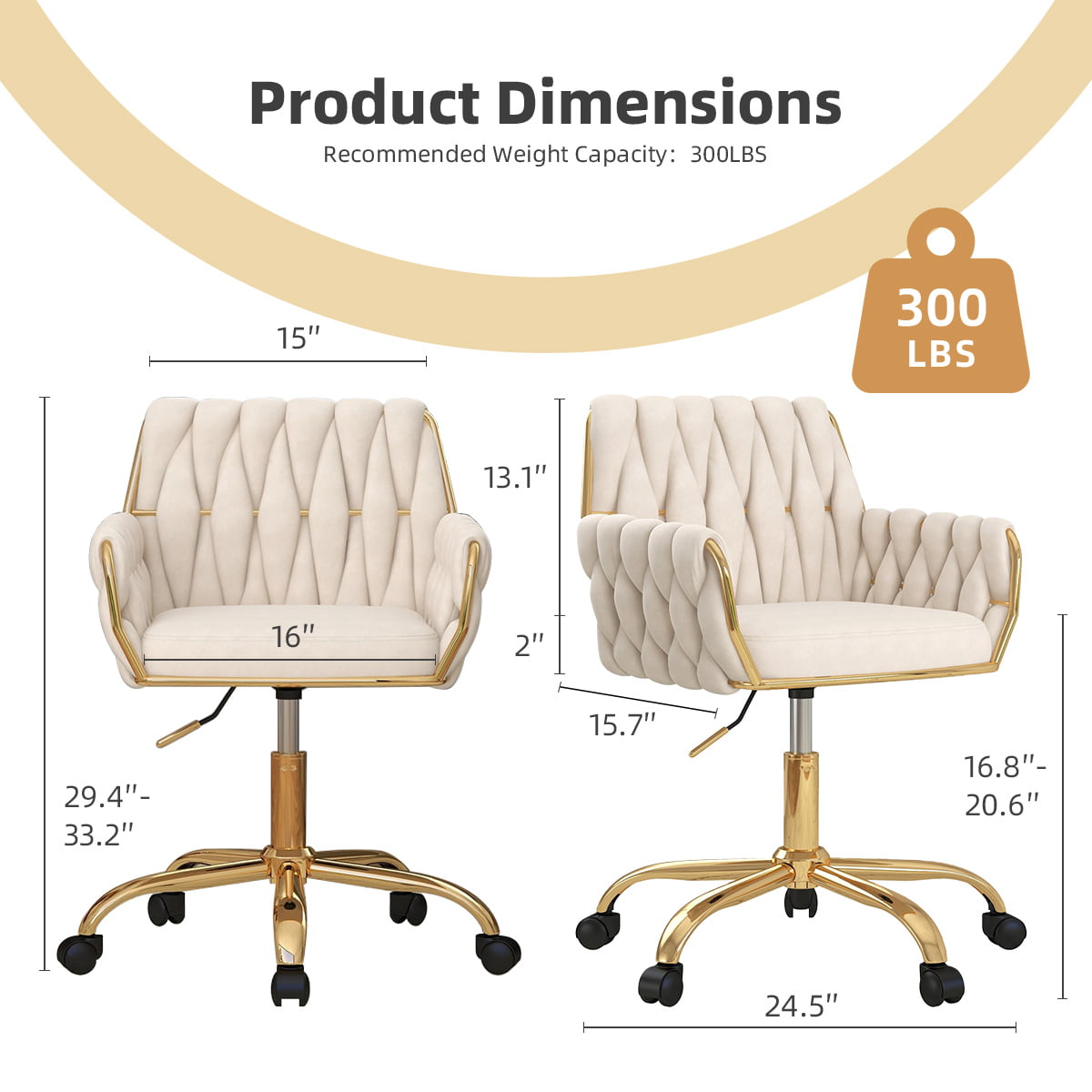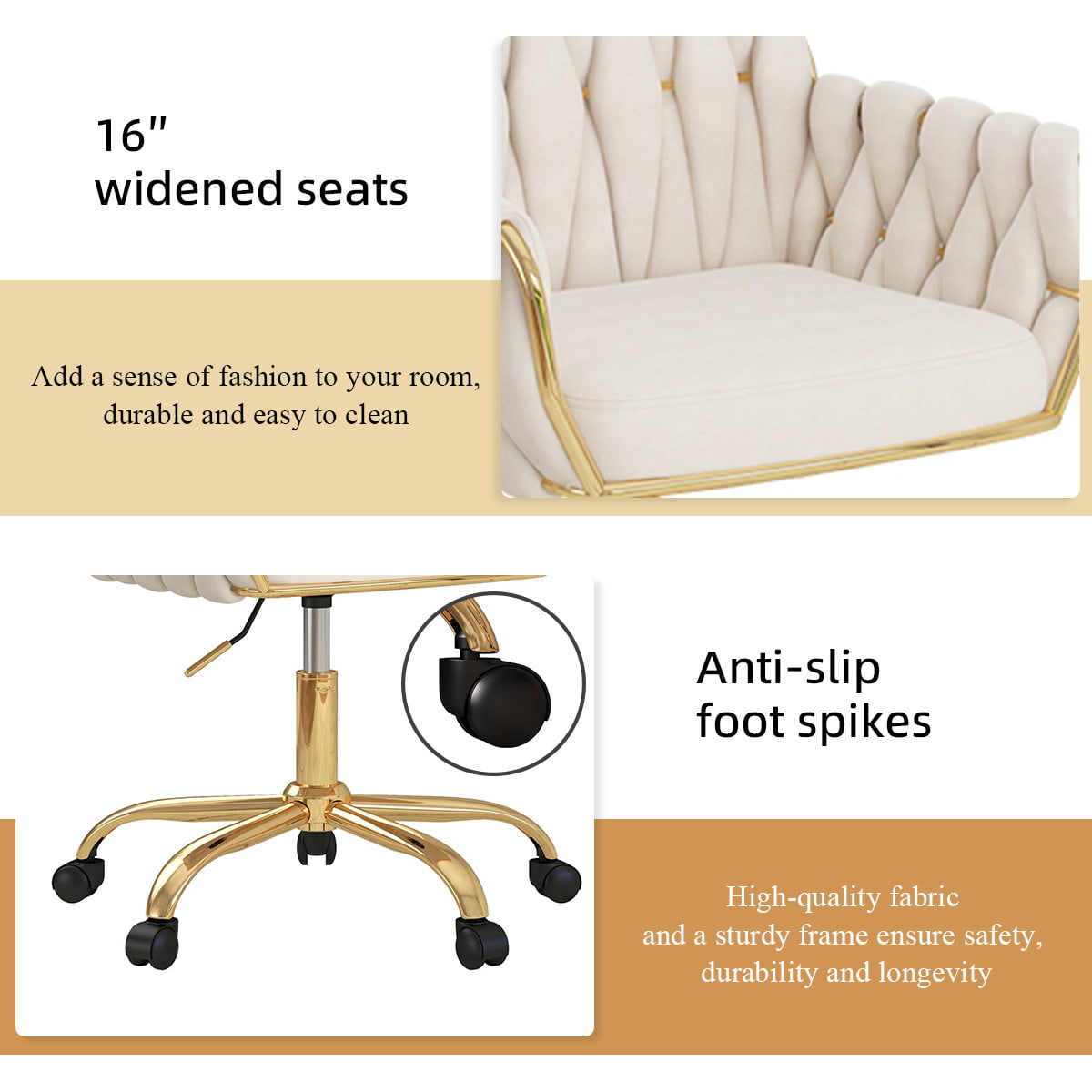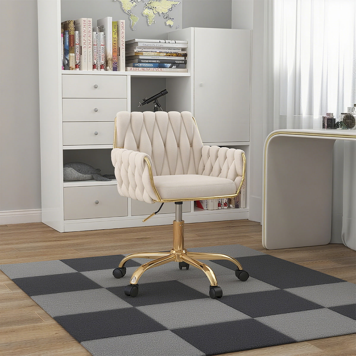 Beige velvet hjemmekontorstol – moderne justerbar vaskestol med gylden base, håndvævet ryglæn og armlæn, 360° drejelig rullebordsstol