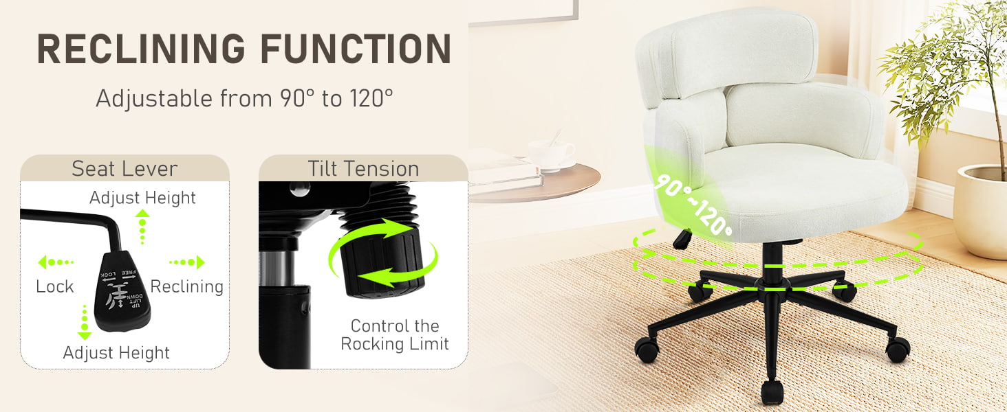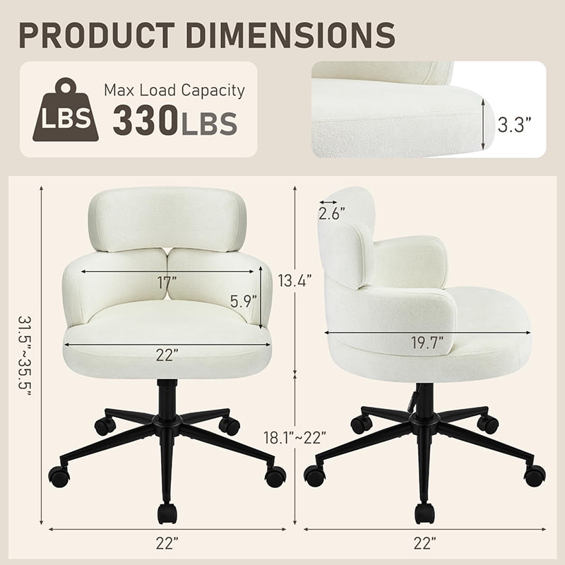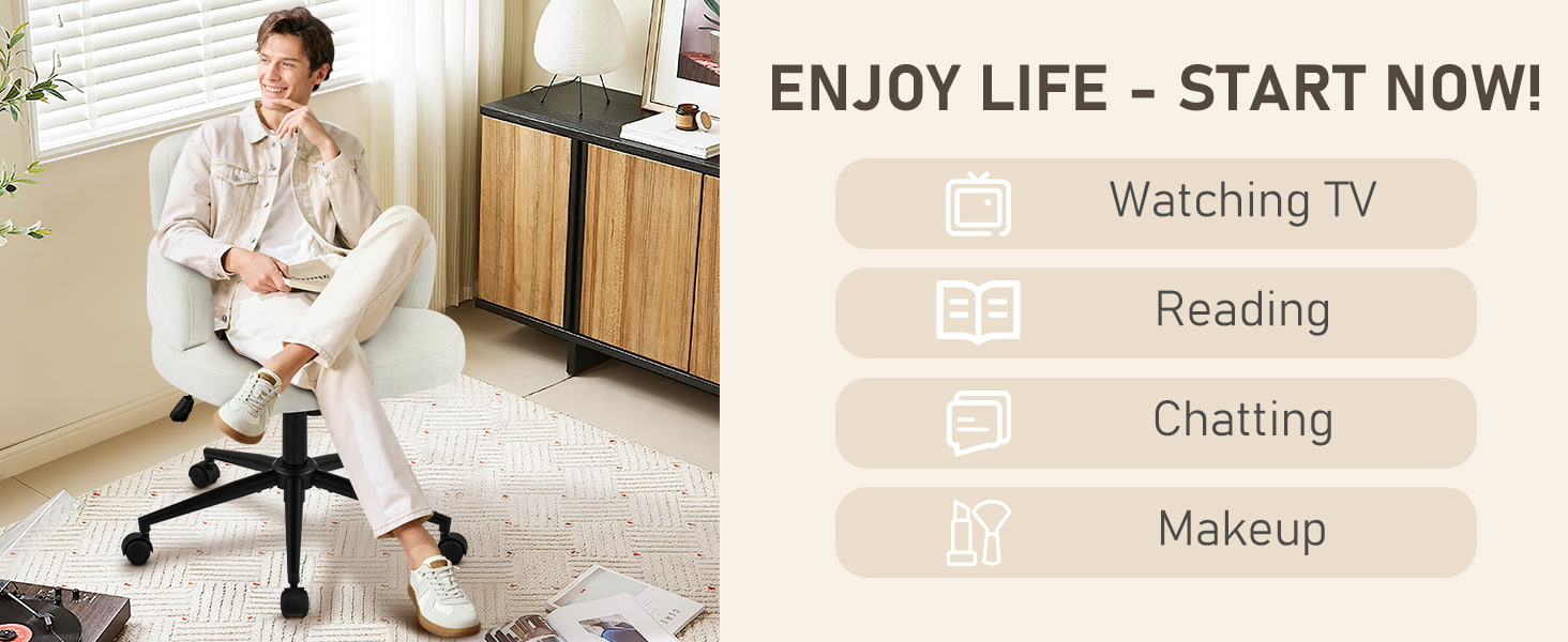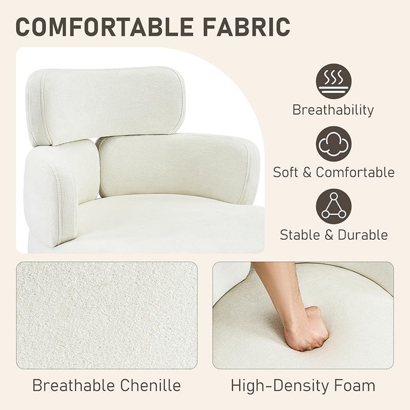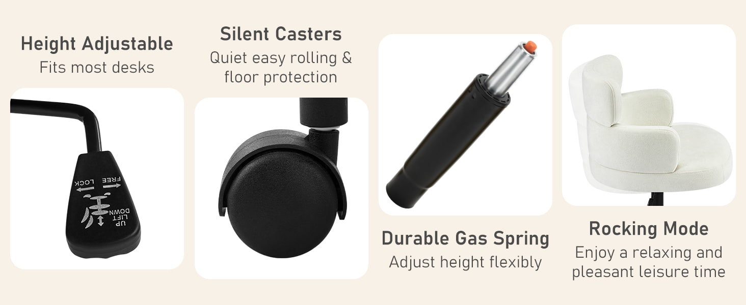Indpakket i åndbart chenillestof og understøttet af en tyk skumpude, leverer stolen langvarig komfort til arbejde, læsning eller afslapning. Justerbar sædehøjde, glat 360° drejning og en blid vippefunktion giver brugerne mulighed for nemt at tilpasse deres siddeposition. En robust metalbund med lydløse hjul sikrer stabilitet, mobilitet og gulvbeskyttelse – hvilket gør det til en praktisk og elegant siddeløsning til moderne livsstil.