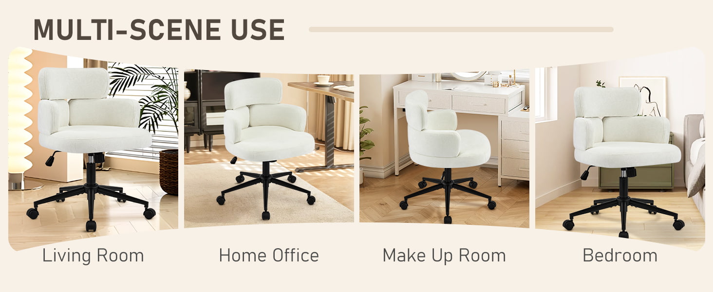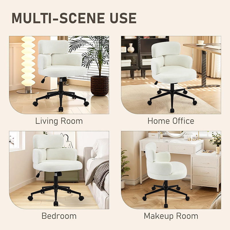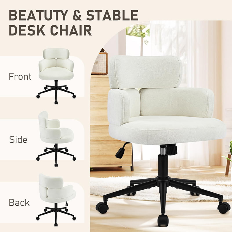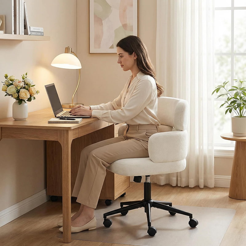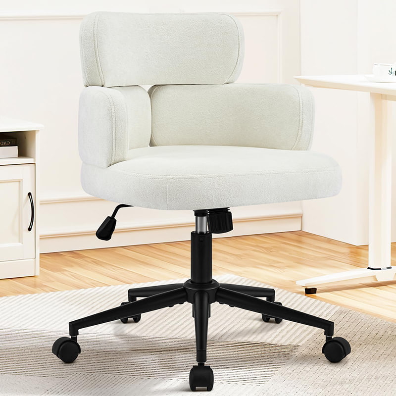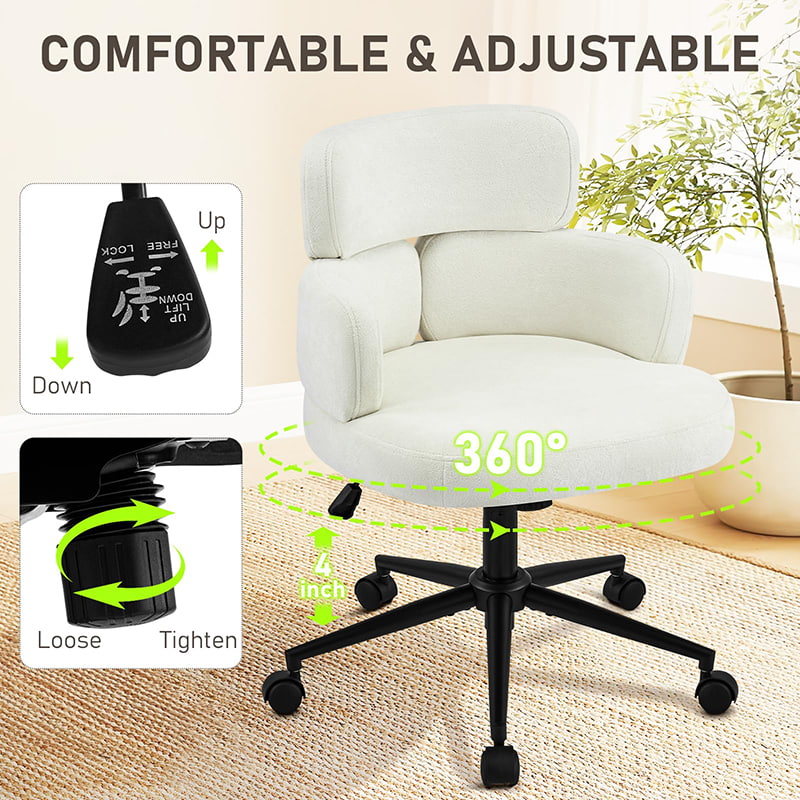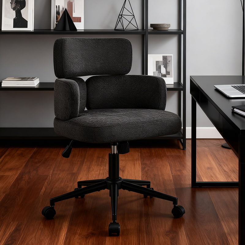 Denne polstrede drejelige kontorstol er designet til moderne hjemmekontorer, boutique-arbejdsområder og livsstilsfokuserede interiører. Med et karakteristisk kløverformet ryglæn med integreret armstøtte, kombinerer denne stol visuel appel med funktionel ergonomi. Det brede, blødt polstrede sæde er betrukket med hudvenligt chenillestof, der tilbyder en blød og behagelig siddeoplevelse til lange timers arbejde, læsning eller afslapning. En justerbar højdemekanisme, glat 360-graders drejning og blid vippefunktion giver brugerne mulighed for nemt at tilpasse deres siddeposition, mens den robuste metalbase og de støjsvage rullende hjul sikrer stabilitet, mobilitet og gulvbeskyttelse på tværs af forskellige miljøer.