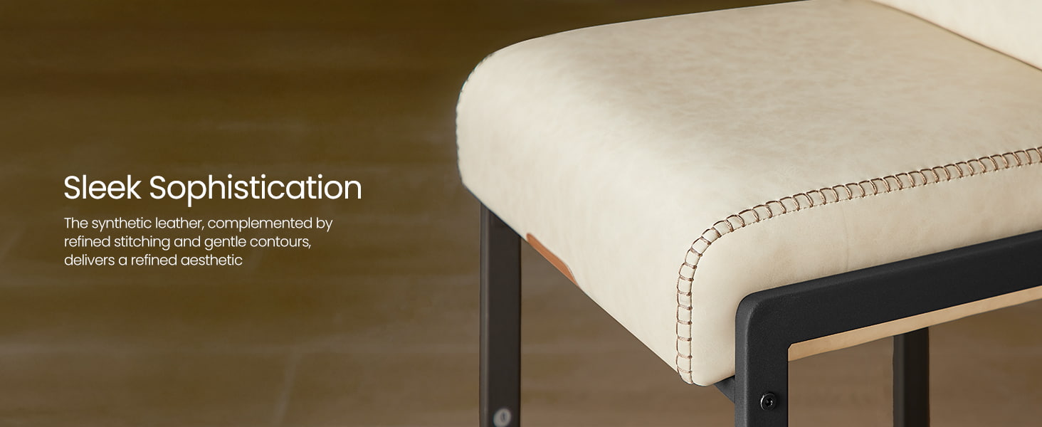 Den glatte syntetiske læderoverflade er detaljeret med subtile syninger, der leverer et håndværksmæssigt look, mens den forbliver nem at vedligeholde - ideel til travle husholdninger og lette kommercielle omgivelser. En let buet sædekant hjælper med at reducere bentrykket, mens den integrerede baglomme tilføjer praktisk opbevaring til telefoner, tablets eller småting. Understøttet af en robust metalramme med skjulte justerbare fødder sikrer denne barstol stabilitet på forskellige gulvoverflader og tilpasser sig ubesværet til moderne køkkener, spisestue eller afslappede underholdende områder.