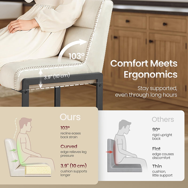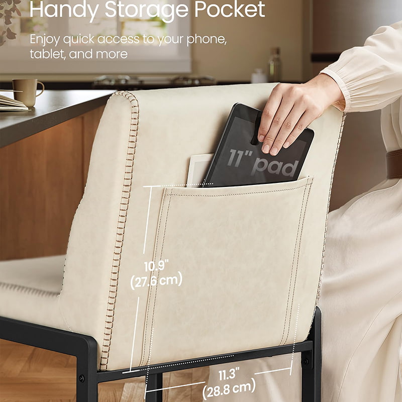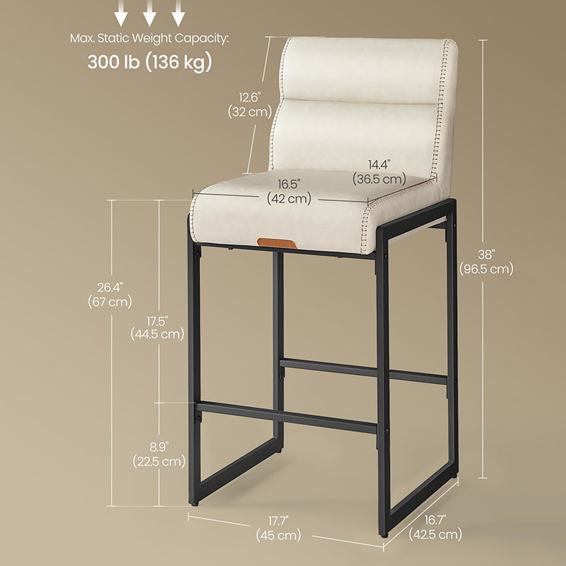 Moderne barstole fra midten af århundredet designet til køkkenborde og spiseøer, disse cremehvide stole i kontrahøjde har slidstærkt syntetisk læderbetræk med raffinerede syninger og en ren arkitektonisk metalramme. Det ergonomiske 103-graders segmenterede ryglæn, 3,9 tommer tykt polstret sæde og buet forkant giver varig komfort til længere siddende, hvilket gør dem velegnede til både boligkøkkener og lette kommercielle miljøer såsom caféer eller showrooms.
