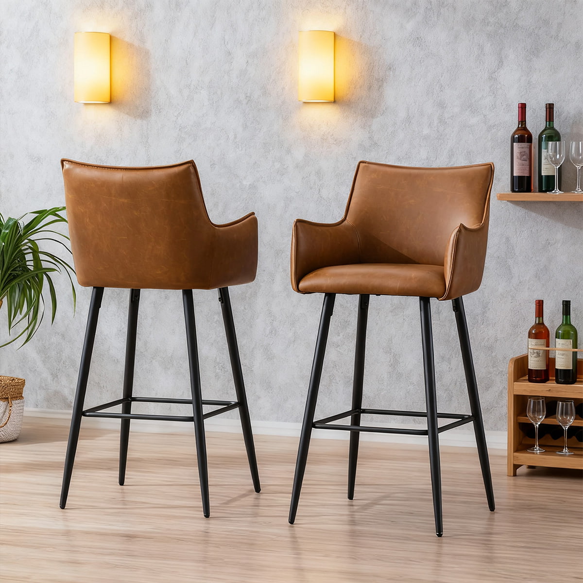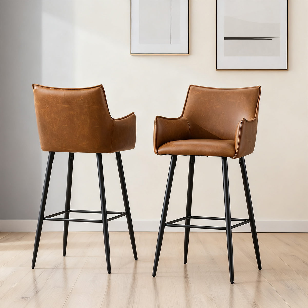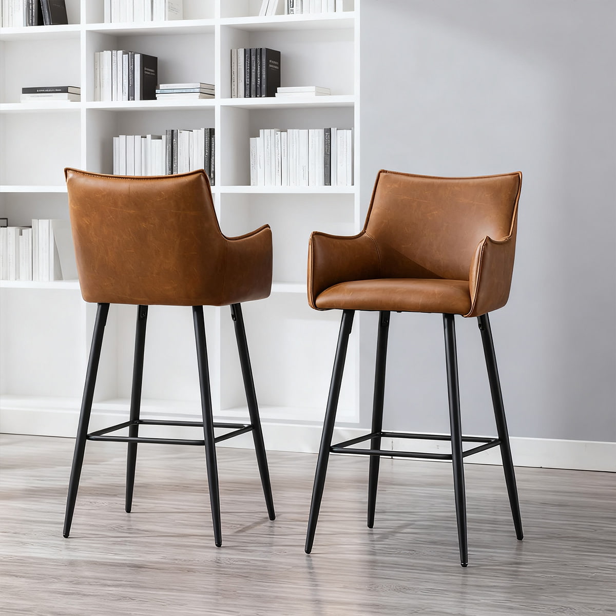 Moderne brun PU-læder barstol med armlæn og ryglæn — polstret barstol i modhøjde med sorte metalben til køkkenø, bistro eller hjemmebar