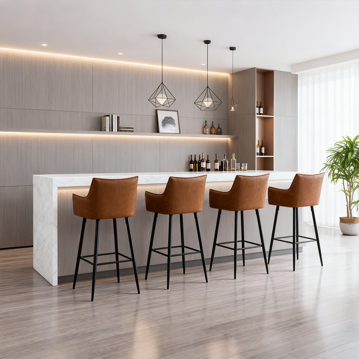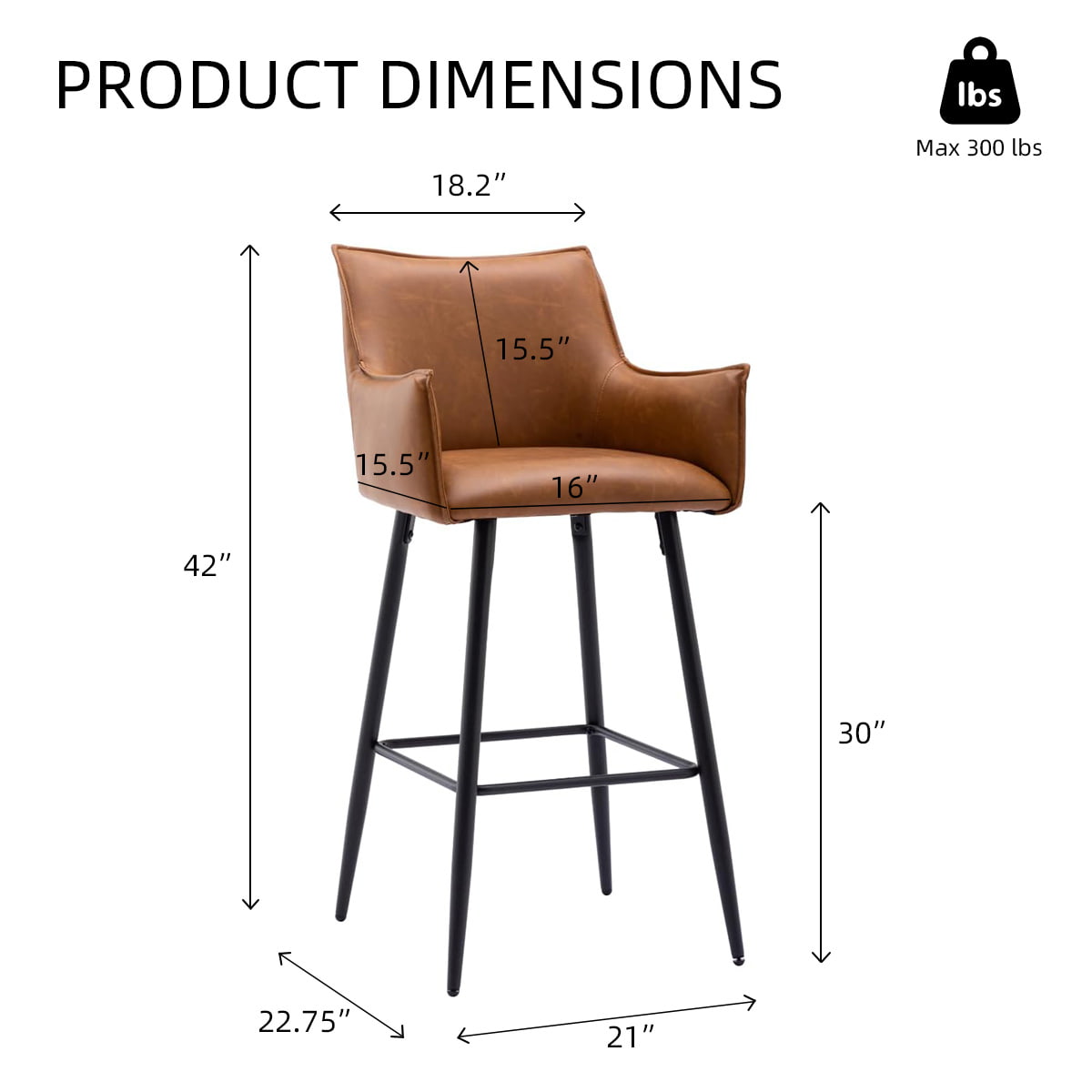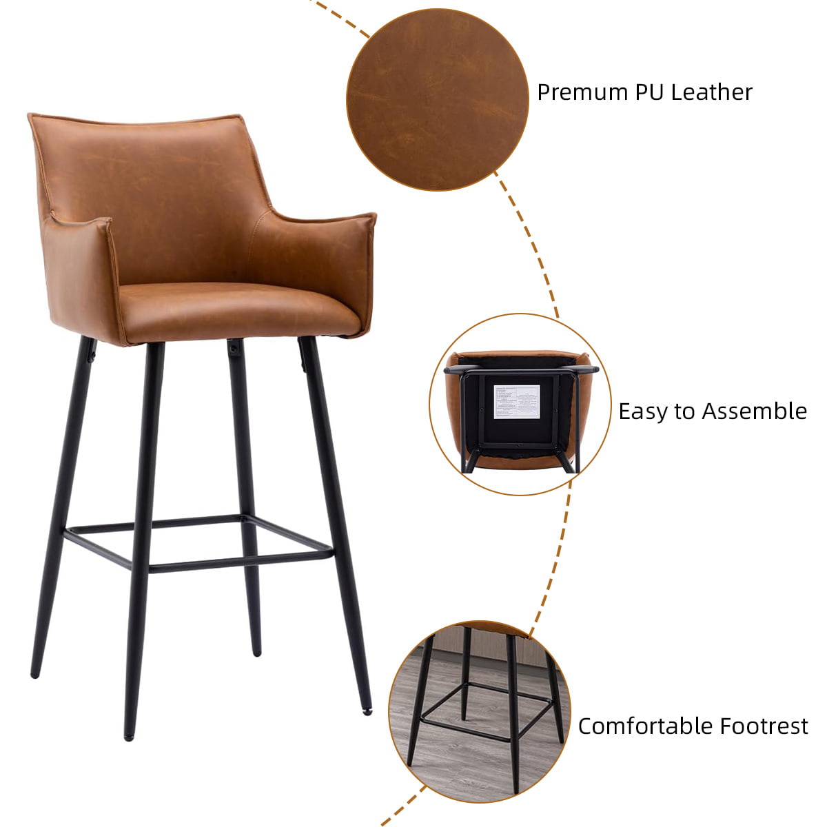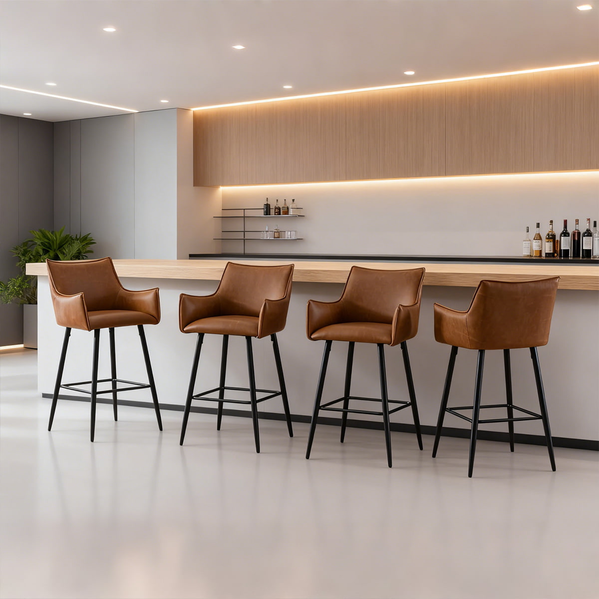 Moderne brun PU-læder barstol med armlæn og ryglæn — polstret barstol i modhøjde med sorte metalben til køkkenø, bistro eller hjemmebar